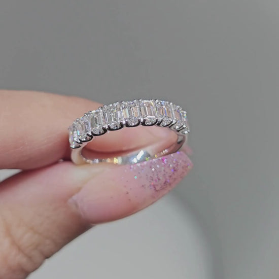 A timeless band set with emerald-cut diamonds all around, offering a clean silhouette and endless brilliance. The perfect choice for those who admire understated elegance.